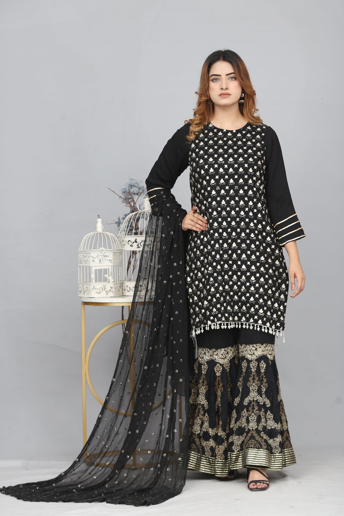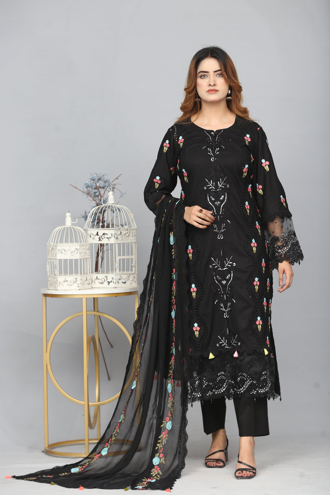 Step into elegance with our stunning black 3-piece ensemble. The shirt features intricate cutwork embroidery...