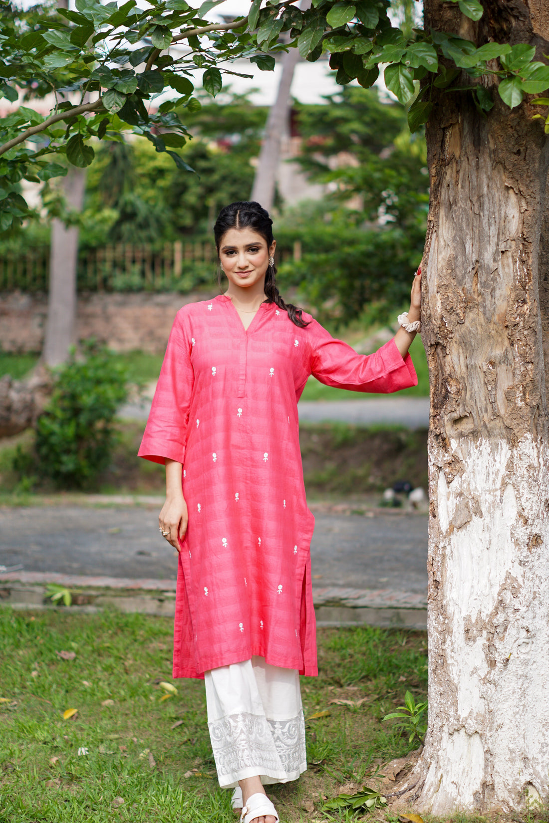 A graceful pink cotton kurta adorned with delicate white embroidery motifs styled in a straight...
