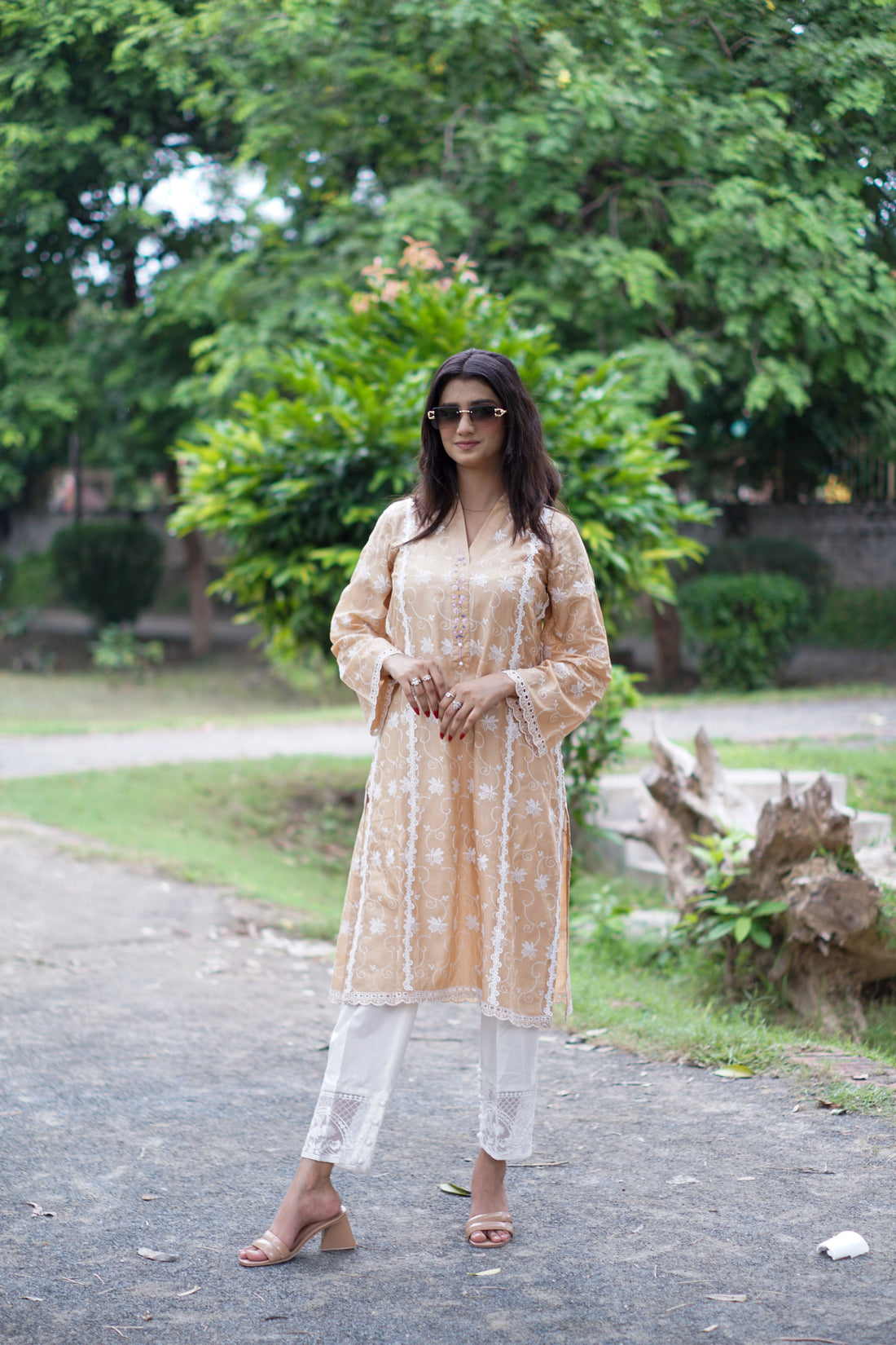 Description:A modest beige cotton kurta, delicately adorned with white thread embroidery in floral and paisley...