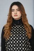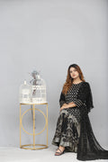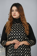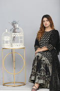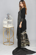 This captivating dress features delicate thread work with tila paired with golden foil detailing, adding a luminous touch to every step.The scattered motifs add life to the classic noir tone.