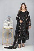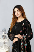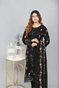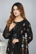 Step into elegance with our stunning black 3-piece ensemble. The shirt features intricate cutwork embroidery with vibrant multicolor floral motifs that add a pop of color to the classic black base. Beautifully detailed sleeves with lace and net cuffs elevate the overall sophistication.