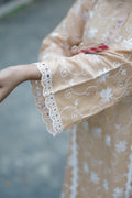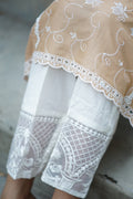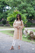 A modest beige cotton kurta, delicately adorned with white thread embroidery in floral and paisley patterns. The neckline is detailed with lace and multi thread embroidery for a touch of elegance. Intricately embroidered scalloped sleeves add charm, while the lightweight fabric ensures all-day comfort.